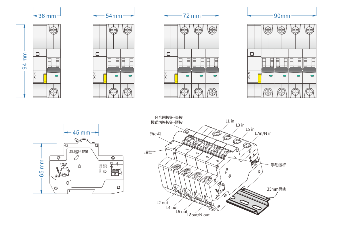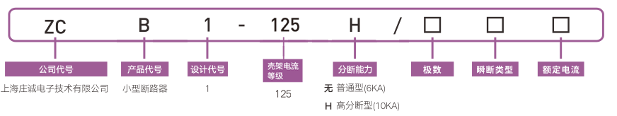 例:ZCB1-125/2P C125 (無漏電功能 分斷能力6kA C型額定電流125A);ZCB1-125H/2P D80(無漏電功能 分斷能力10kA D型額定電流80A)。