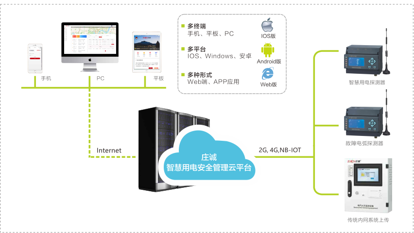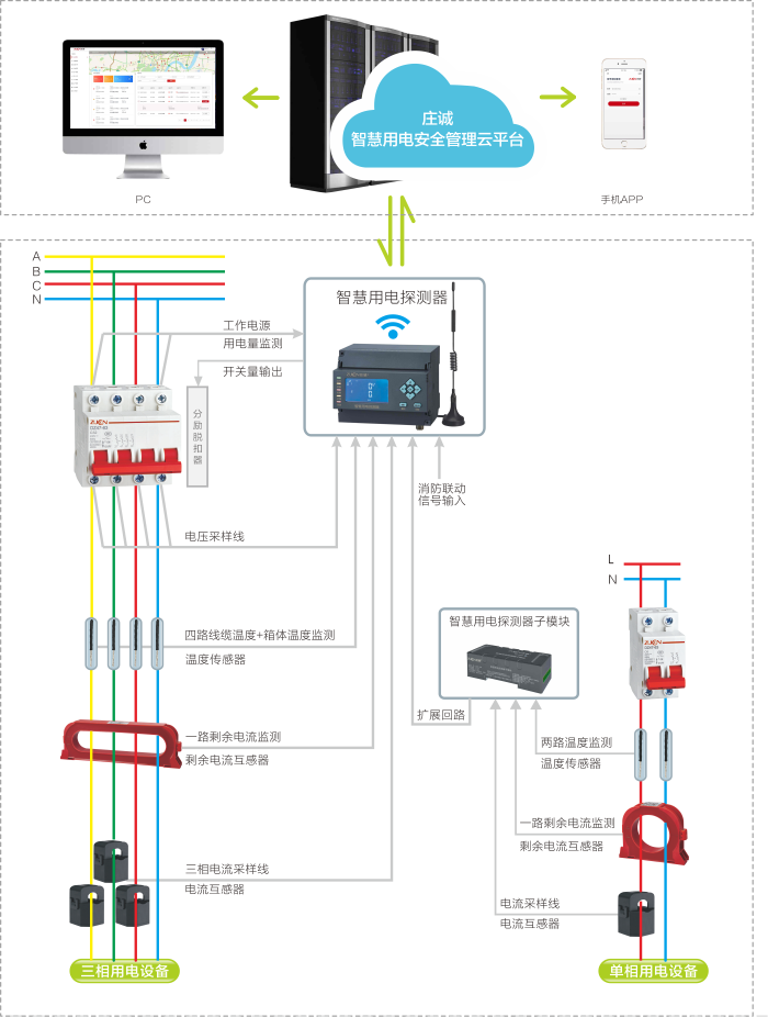 本系統基本組成:智慧用電探測器、故障電弧探測器、剩余電流互感器、電流互感器、溫度傳感器、傳輸網絡、智慧安全用電管理云平臺和客戶端。