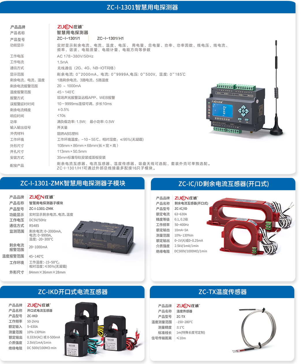 ZC-1-1301智慧用電探測器作為智慧用電安全管理云平臺的感知層探測器裝置,該裝置實時監測配電回路中的電源電壓、電流、溫度、剩余電流等參數,出現有過壓、欠壓、過流、剩余電流超限、溫度超限等異常時,探測器能夠實時通過內置的2G、4G、NB-IOT等無線模組將報警信息上傳到智慧用電安全管理云平臺,并通過云平臺將數據信息發送至WEB端及相關負責人的APP,實時發現線路用電安全隱患。