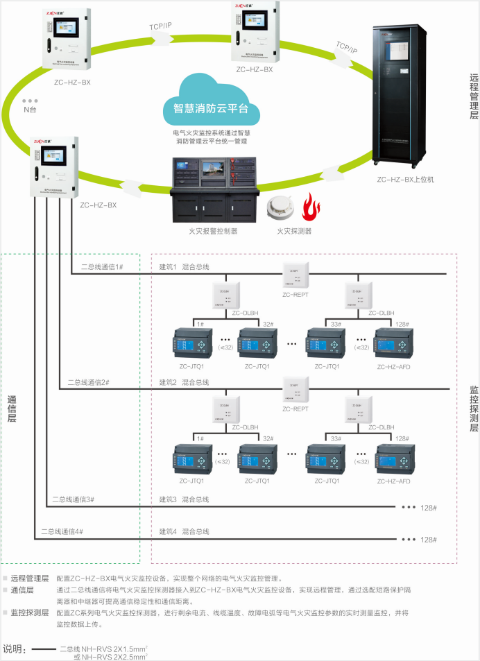 ZC-HZ電氣火災(zāi)監(jiān)控系統(tǒng)滿足并優(yōu)于GB14287.1.2.3 .4-2014《 電氣火災(zāi)監(jiān)控設(shè)備、 剩余電流式電氣火災(zāi)監(jiān)控探測器、測溫式電氣火災(zāi)監(jiān)控探測器、 故障電弧探測器》的國家標準要求。采用了當今智能互聯(lián)網(wǎng)技術(shù)領(lǐng)域的諸多先進技術(shù),如:ARM系列高性能32位RISC微控制器、 DSP數(shù)字信號處理技術(shù)、CAN總線技術(shù)、Internet網(wǎng)絡(luò)互連技術(shù)、嵌入式操作系統(tǒng)等,在電氣火災(zāi)監(jiān)控的可靠性方面具有國際先進水平。